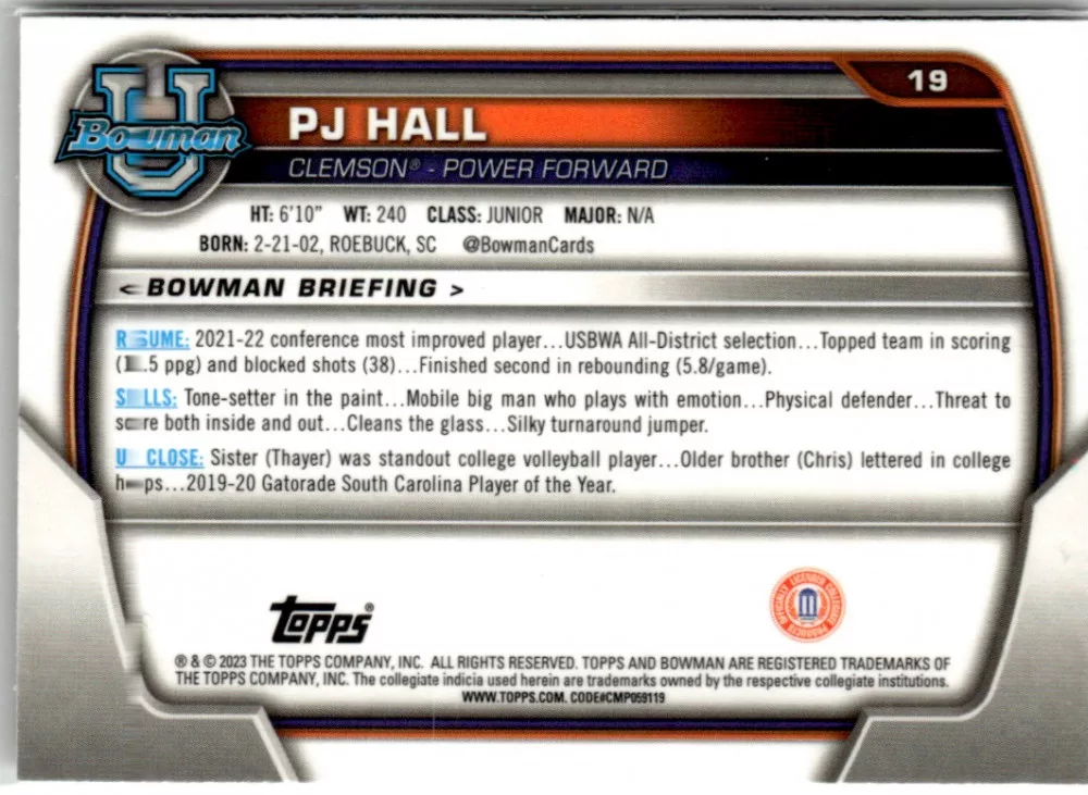 Az eladásra kínált 2022-23 Bowman Chrome University #19 PJ Hall kosaras kártya NM-MT állapotban van. A kosaras kártyákat legtöbb esetben UP Platinum/Standard puha védőtokban és/vagy UP Toploader (kemény védőtok)-ben küldjük.