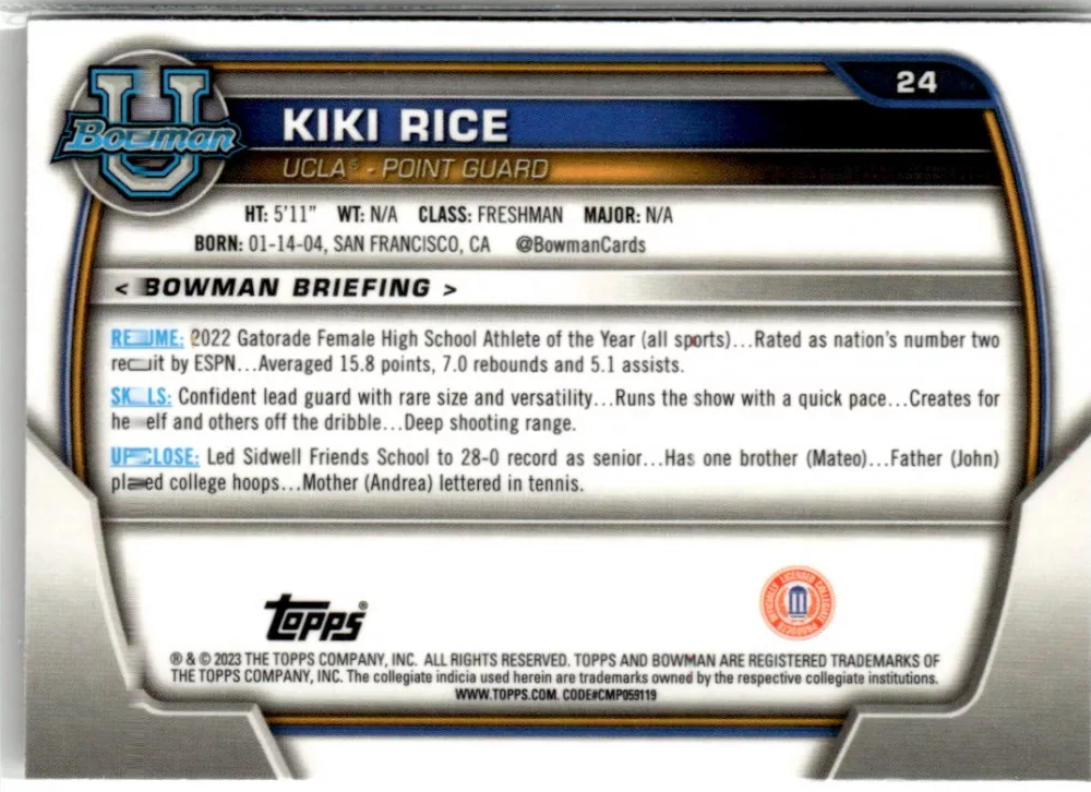 Az eladásra kínált 2022-23 Bowman Chrome University #24 Kiki Rice kosaras kártya NM-MT állapotban van. A kosaras kártyákat legtöbb esetben UP Platinum/Standard puha védőtokban és/vagy UP Toploader (kemény védőtok)-ben küldjük.