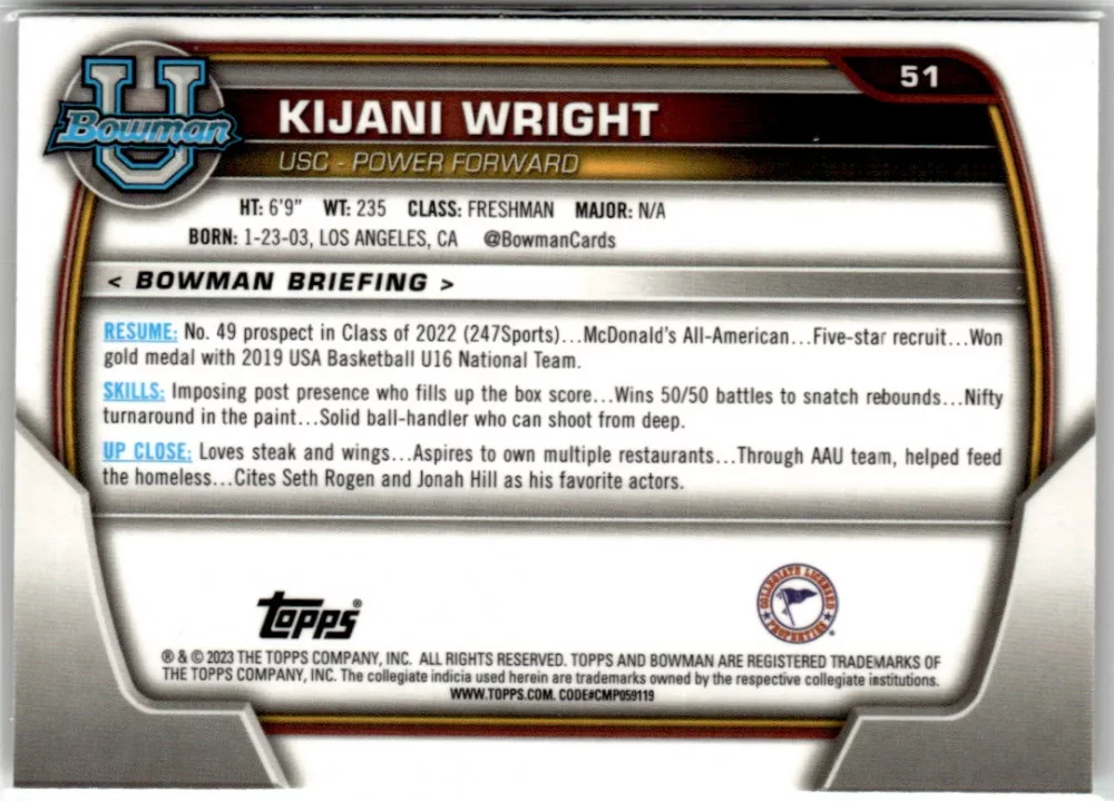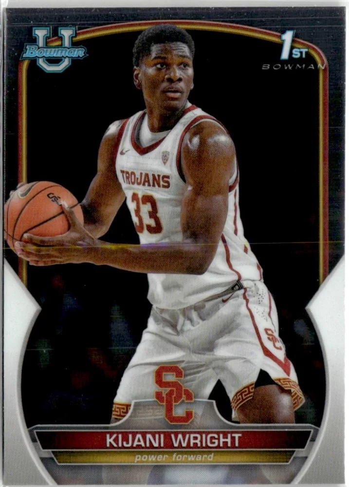 Az eladásra kínált 2022-23 Bowman Chrome University #51 Kijani Wright kosaras kártya NM-MT állapotban van. A kosaras kártyákat legtöbb esetben UP Platinum/Standard puha védőtokban és/vagy UP Toploader (kemény védőtok)-ben küldjük.