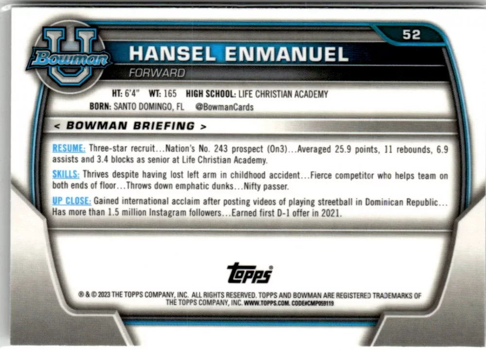 2022-23 Bowman Chrome University #52 Hansel Enmanuel