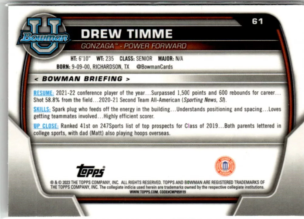 Az eladásra kínált 2022-23 Bowman Chrome University #61 Drew Timme kosaras kártya NM-MT állapotban van. A kosaras kártyákat legtöbb esetben UP Platinum/Standard puha védőtokban és/vagy UP Toploader (kemény védőtok)-ben küldjük.