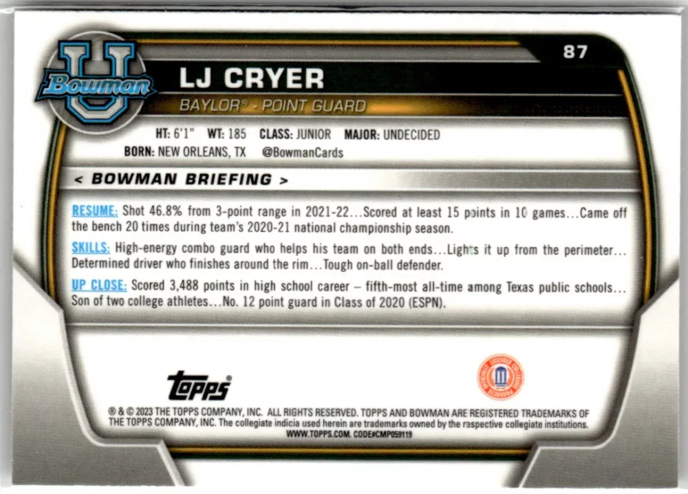 2022-23 Bowman Chrome University  #87 LJ Cryer