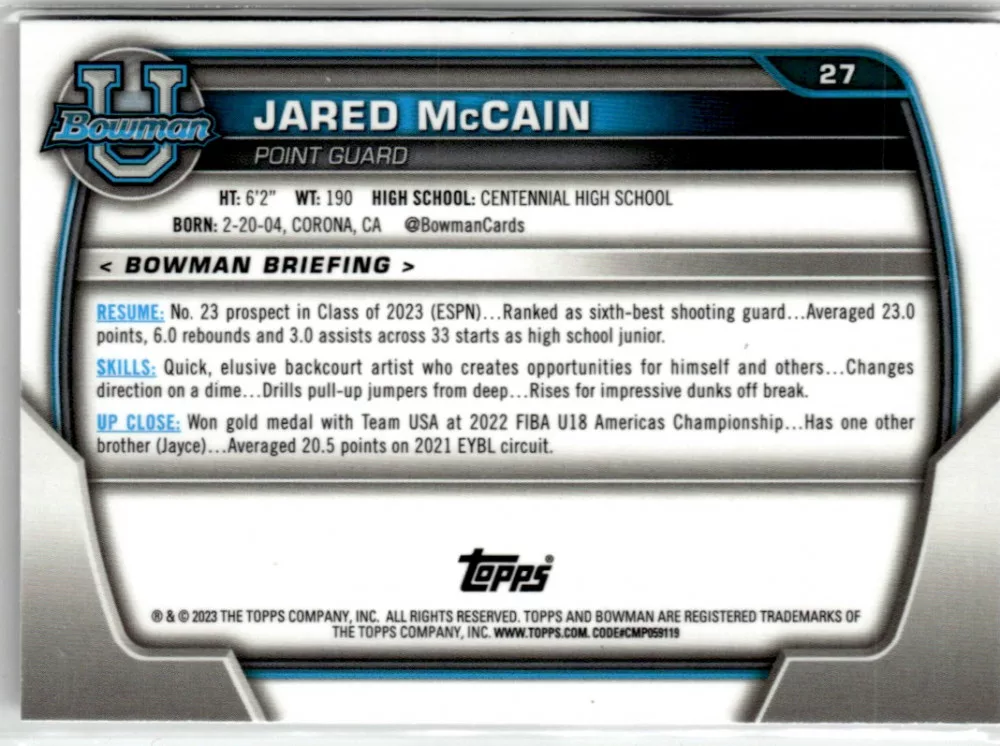 Az eladásra kínált 2022-23 Bowman Chrome University Shimmer Refractors #27 Jared McCain kosaras kártya NM-MT állapotban van. A kosaras kártyákat legtöbb esetben UP Platinum/Standard puha védőtokban és/vagy UP Toploader (kemény védőtok)-ben küldjük.