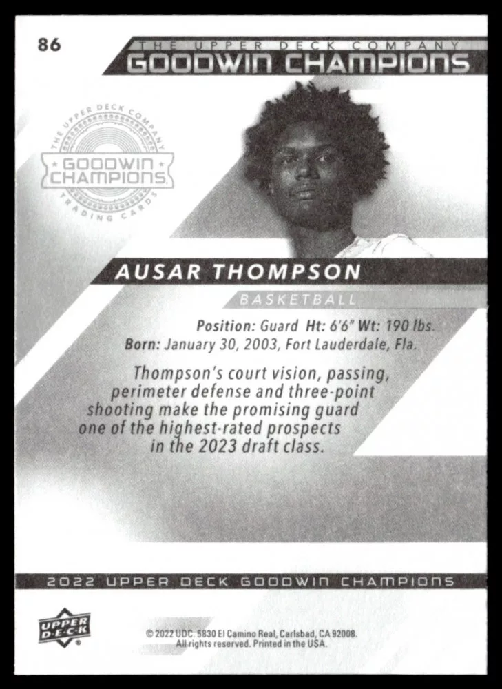 Az eladásra kínált 2022-23 Upper Deck Goodwin Champions Horizontal #86 Ausar Thompson kosaras kártya NM-MT állapotban van. A kosaras kártyákat legtöbb esetben UP Platinum/Standard puha védőtokban és/vagy UP Toploader (kemény védőtok)-ben küldjük.