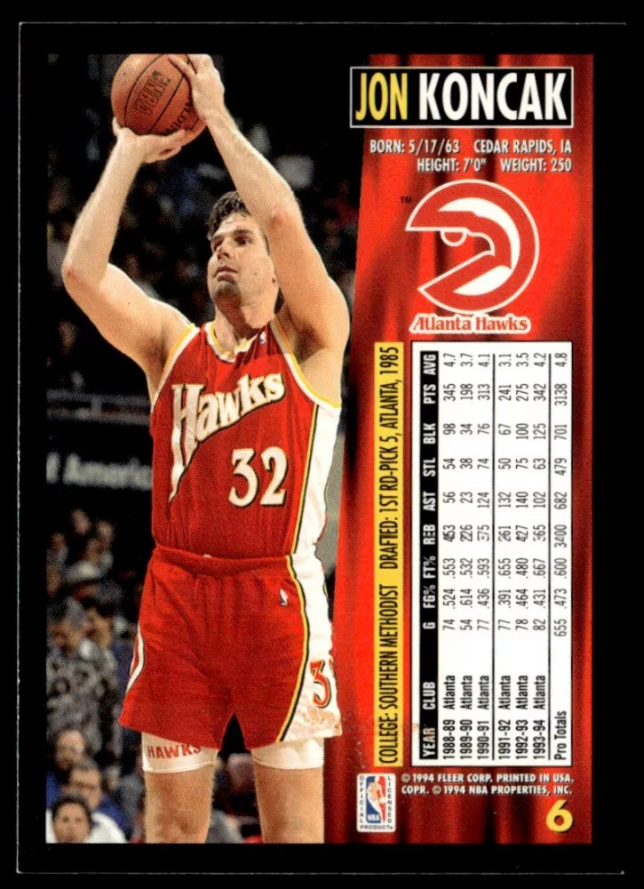 Az eladásra kínált 1994-95 Fleer #6 Jon Koncak kosaras kártya NM-MT állapotban van. A kosaras kártyákat legtöbb esetben UP Platinum/Standard puha védőtokban és/vagy UP Toploader (kemény védőtok)-ben küldjük.