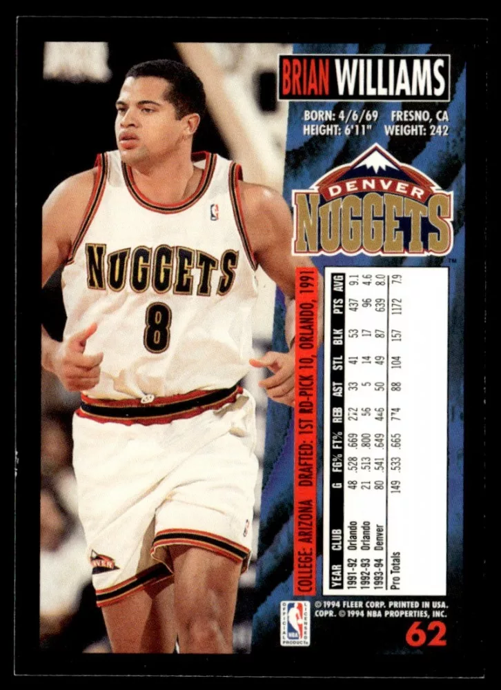 Az eladásra kínált 1994-95 Fleer #62 Brian Williams kosaras kártya NM-MT állapotban van. A kosaras kártyákat legtöbb esetben UP Platinum/Standard puha védőtokban és/vagy UP Toploader (kemény védőtok)-ben küldjük.