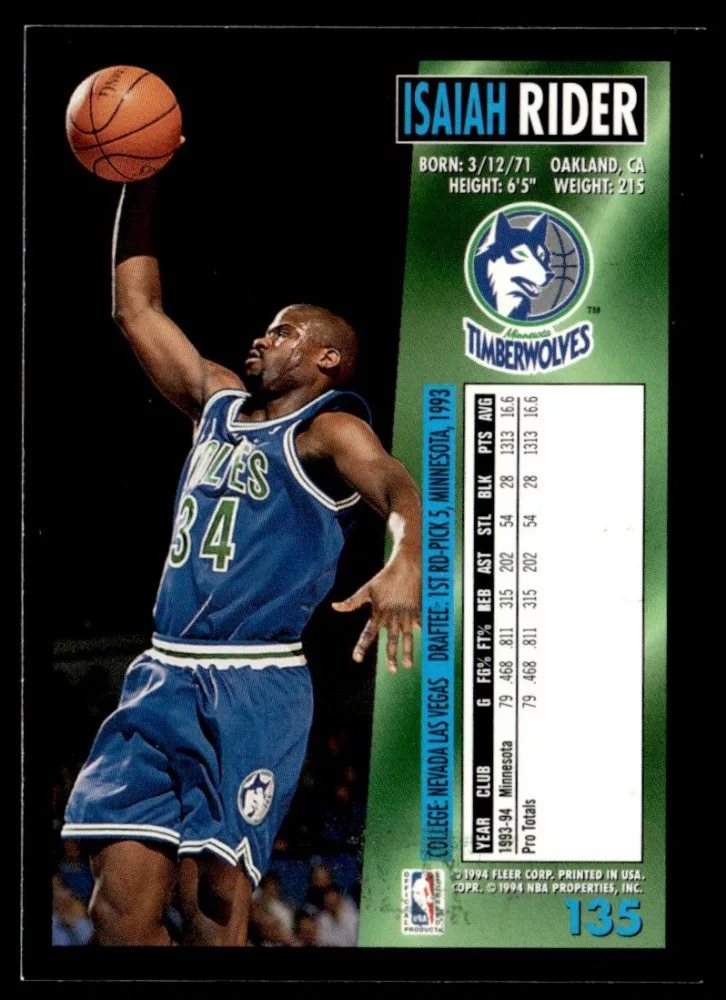Az eladásra kínált 1994-95 Fleer #135 Isaiah Rider kosaras kártya NM-MT állapotban van. A kosaras kártyákat legtöbb esetben UP Platinum/Standard puha védőtokban és/vagy UP Toploader (kemény védőtok)-ben küldjük.