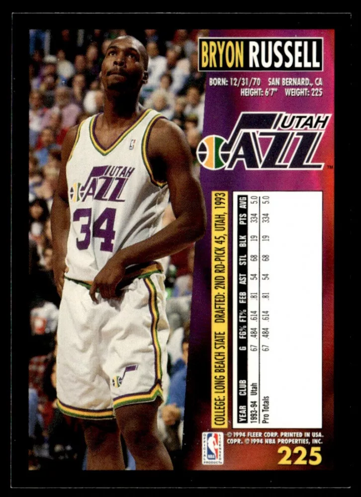 Az eladásra kínált 1994-95 Fleer #225 Bryon Russell kosaras kártya NM-MT állapotban van. A kosaras kártyákat legtöbb esetben UP Platinum/Standard puha védőtokban és/vagy UP Toploader (kemény védőtok)-ben küldjük.