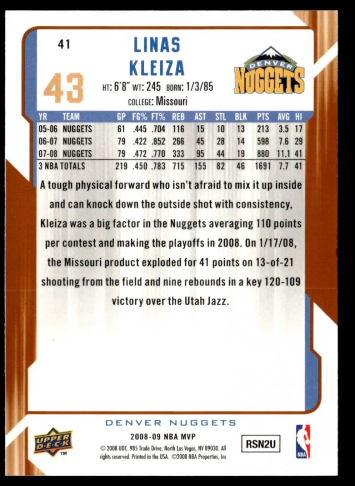Az eladásra kínált 2008-2009 Upper Deck MVP #41 Linas Kleiza kosaras kártya NM-MT állapotban van. A kosaras kártyákat legtöbb esetben UP Platinum/Standard puha védőtokban és/vagy UP Toploader (kemény védőtok)-ben küldjük.