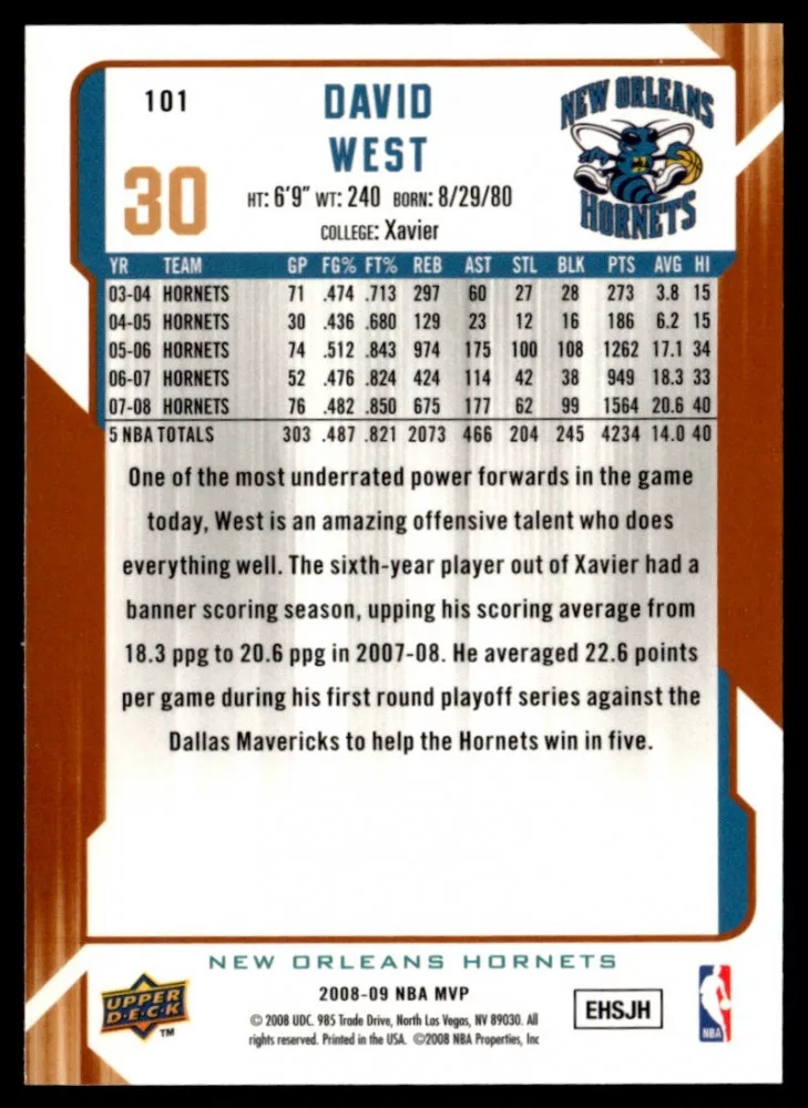 Az eladásra kínált 2008-2009 Upper Deck MVP #101 David West kosaras kártya NM-MT állapotban van. A kosaras kártyákat legtöbb esetben UP Platinum/Standard puha védőtokban és/vagy UP Toploader (kemény védőtok)-ben küldjük.