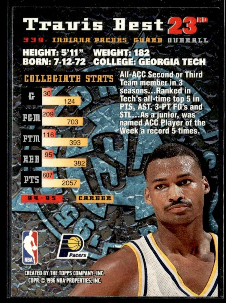Az eladásra kínált 1995-96 Stadium Club #339 Travis Best kosaras kártya NM-MT állapotban van. A kosaras kártyákat legtöbb esetben UP Platinum/Standard puha védőtokban és/vagy UP Toploader (kemény védőtok)-ben küldjük.
