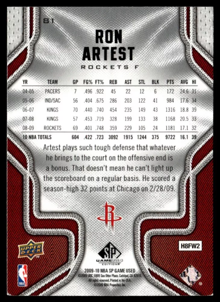 Az eladásra kínált 2009-10 SP Game Used #81 Ron Artest kosaras kártya NM-MT állapotban van. A kosaras kártyákat legtöbb esetben UP Platinum/Standard puha védőtokban és/vagy UP Toploader (kemény védőtok)-ben küldjük.