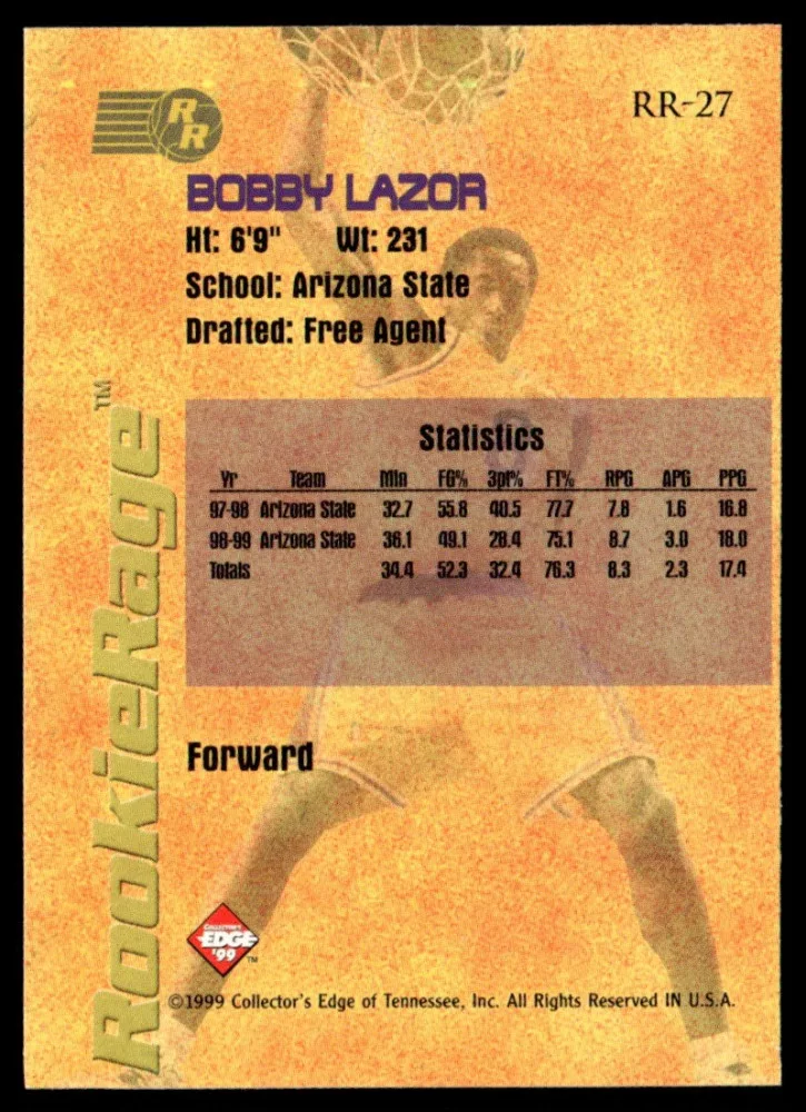 Az eladásra kínált 1999-2000 Collector's Edge Rookie Rage #RR-27 Bobby Lazor kosaras kártya NM-MT állapotban van. A kosaras kártyákat legtöbb esetben UP Platinum/Standard puha védőtokban és/vagy UP Toploader (kemény védőtok)-ben küldjük.