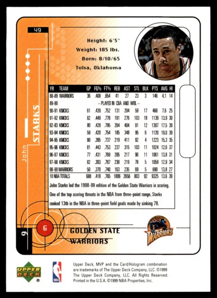 Az eladásra kínált 1999-2000 Upper Deck MVP #49 John Starks kosaras kártya NM-MT állapotban van. A kosaras kártyákat legtöbb esetben UP Platinum/Standard puha védőtokban és/vagy UP Toploader (kemény védőtok)-ben küldjük.