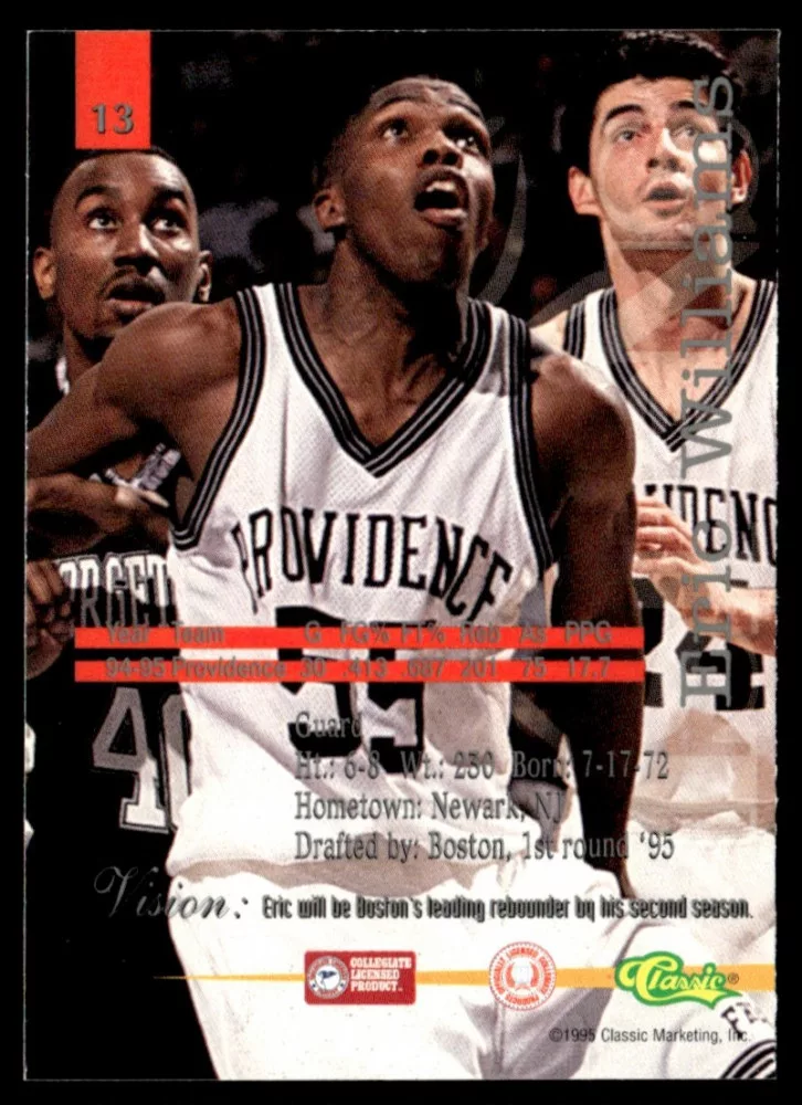 Az eladásra kínált 1995-96 Classic Visions #13 Eric Williams kosaras kártya NM-MT állapotban van. A kosaras kártyákat legtöbb esetben UP Platinum/Standard puha védőtokban és/vagy UP Toploader (kemény védőtok)-ben küldjük.