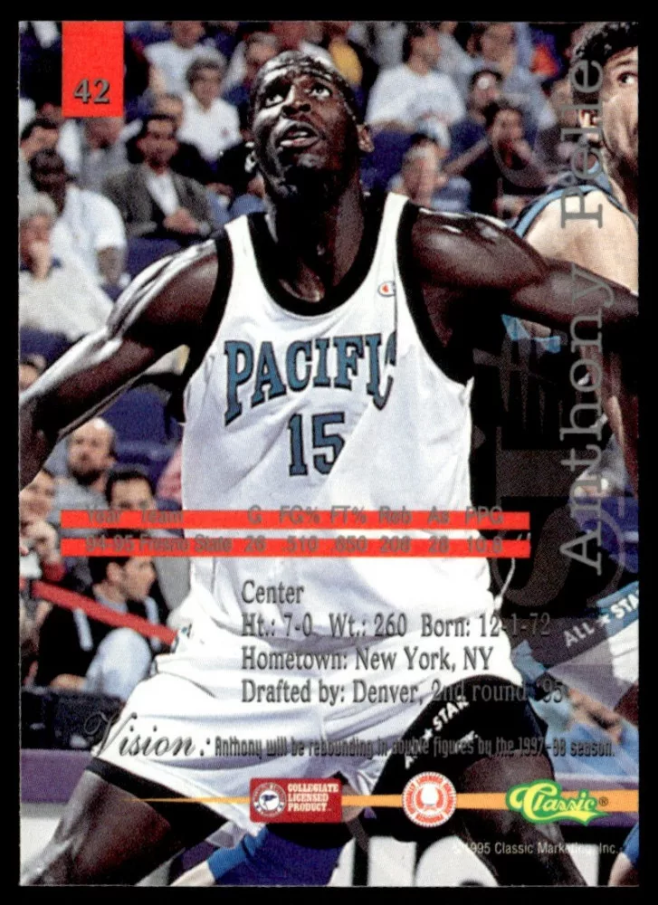 Az eladásra kínált 1995-96 Classic Visions #42 Anthony Pelle kosaras kártya NM-MT állapotban van. A kosaras kártyákat legtöbb esetben UP Platinum/Standard puha védőtokban és/vagy UP Toploader (kemény védőtok)-ben küldjük.