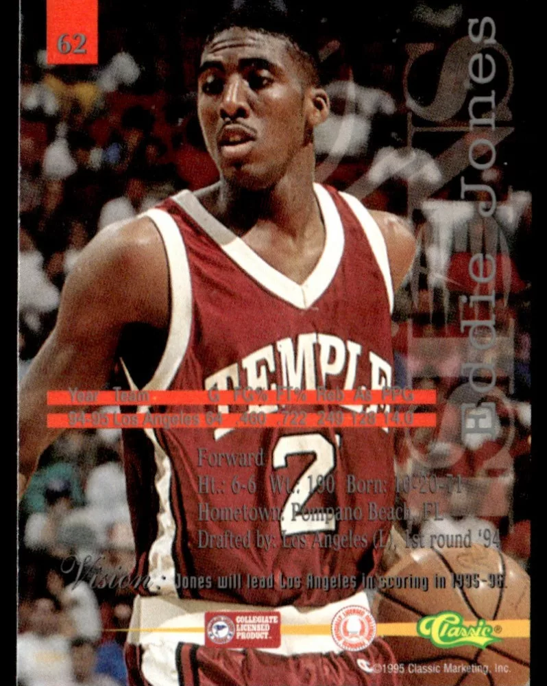 Az eladásra kínált 1995-96 Classic Visions #62 Eddie Jones kosaras kártya NM-MT állapotban van. A kosaras kártyákat legtöbb esetben UP Platinum/Standard puha védőtokban és/vagy UP Toploader (kemény védőtok)-ben küldjük.