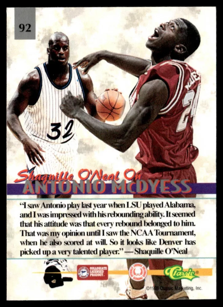 Az eladásra kínált 1995-96 Classic Visions #92 Antonio McDyess kosaras kártya NM-MT állapotban van. A kosaras kártyákat legtöbb esetben UP Platinum/Standard puha védőtokban és/vagy UP Toploader (kemény védőtok)-ben küldjük.