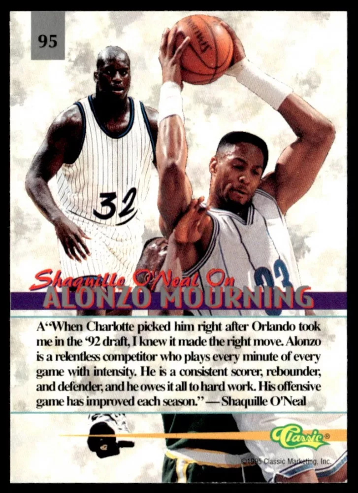 Az eladásra kínált 1995-96 Classic Visions #95 Alonzo Mourning kosaras kártya NM-MT állapotban van. A kosaras kártyákat legtöbb esetben UP Platinum/Standard puha védőtokban és/vagy UP Toploader (kemény védőtok)-ben küldjük.