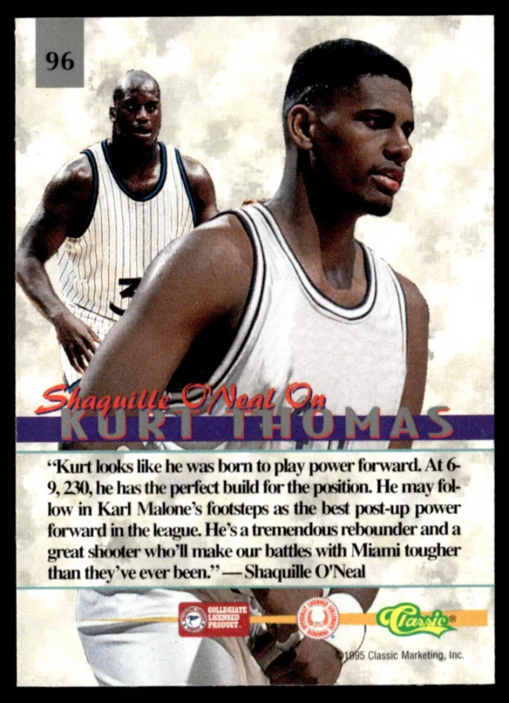 Az eladásra kínált 1995-96 Classic Visions #96 Kurt Thomas kosaras kártya NM-MT állapotban van. A kosaras kártyákat legtöbb esetben UP Platinum/Standard puha védőtokban és/vagy UP Toploader (kemény védőtok)-ben küldjük.