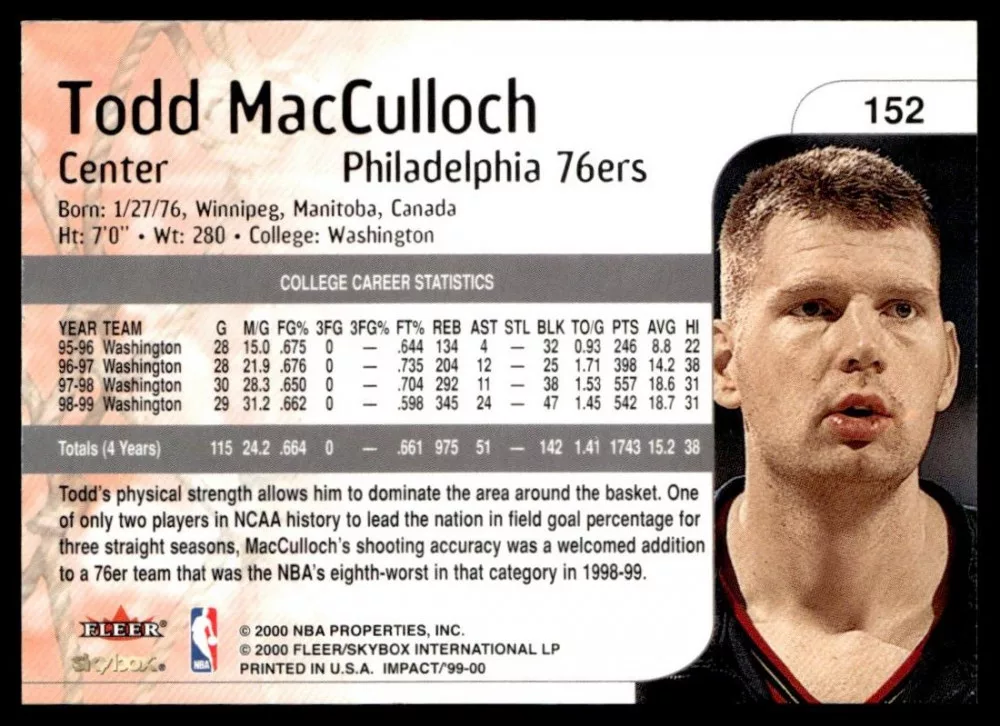 Az eladásra kínált 1999-2000 SkyBox Impact #152 Todd MacCulloch kosaras kártya NM-MT állapotban van. A kosaras kártyákat legtöbb esetben UP Platinum/Standard puha védőtokban és/vagy UP Toploader (kemény védőtok)-ben küldjük.