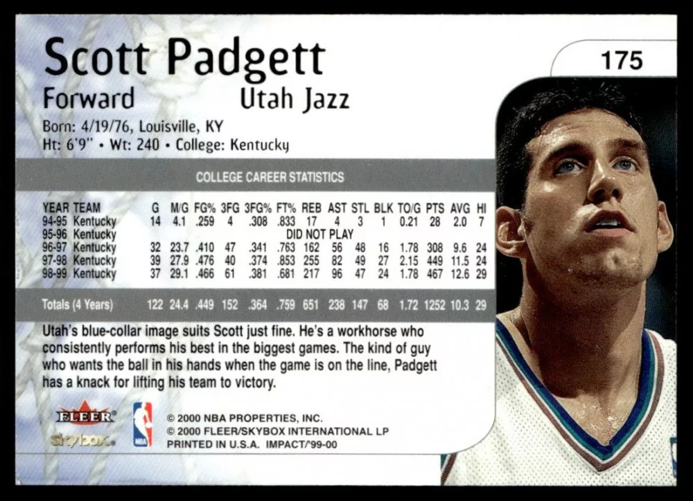 Az eladásra kínált 1999-2000 SkyBox Impact #175 Scott Padgett kosaras kártya NM-MT állapotban van. A kosaras kártyákat legtöbb esetben UP Platinum/Standard puha védőtokban és/vagy UP Toploader (kemény védőtok)-ben küldjük.