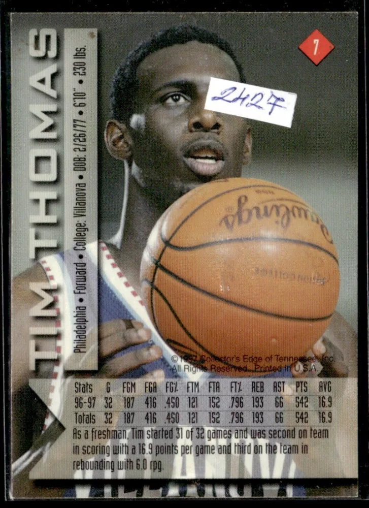 Az eladásra kínált 1997-98 Collector's Edge Impulse Gold #7 Tim Thomas kosaras kártya NM-MT állapotban van. A kosaras kártyákat legtöbb esetben UP Platinum/Standard puha védőtokban és/vagy UP Toploader (kemény védőtok)-ben küldjük.