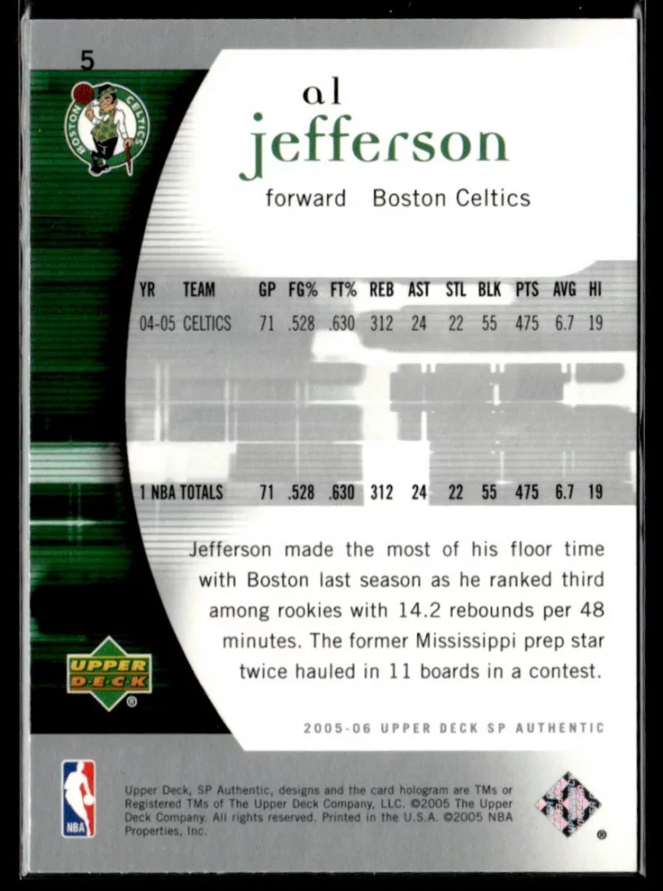 Az eladásra kínált 2005-06 SP Authentic #5 Al Jefferson kosaras kártya NM-MT állapotban van. A kosaras kártyákat legtöbb esetben UP Platinum/Standard puha védőtokban és/vagy UP Toploader (kemény védőtok)-ben küldjük.