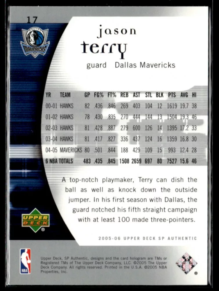Az eladásra kínált 2005-06 SP Authentic #17 Jason Terry kosaras kártya NM-MT állapotban van. A kosaras kártyákat legtöbb esetben UP Platinum/Standard puha védőtokban és/vagy UP Toploader (kemény védőtok)-ben küldjük.
