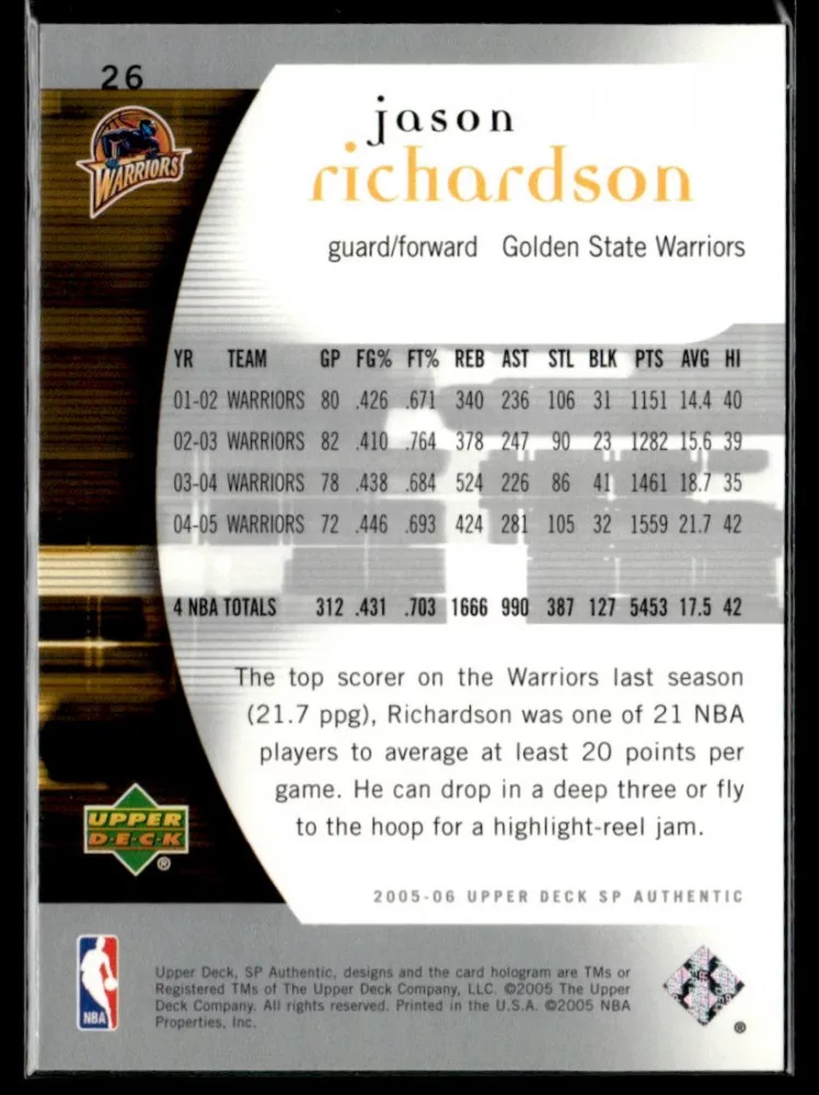 Az eladásra kínált 2005-06 SP Authentic #26 Jason Richardson kosaras kártya NM-MT állapotban van. A kosaras kártyákat legtöbb esetben UP Platinum/Standard puha védőtokban és/vagy UP Toploader (kemény védőtok)-ben küldjük.