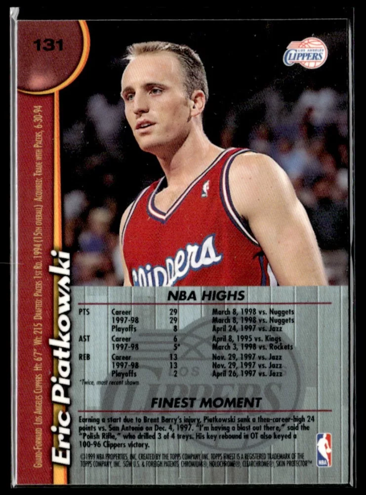 Az eladásra kínált 1998-99 Finest #131 Eric Piatkowski kosaras kártya NM-MT állapotban van. A kosaras kártyákat legtöbb esetben UP Platinum/Standard puha védőtokban és/vagy UP Toploader (kemény védőtok)-ben küldjük.