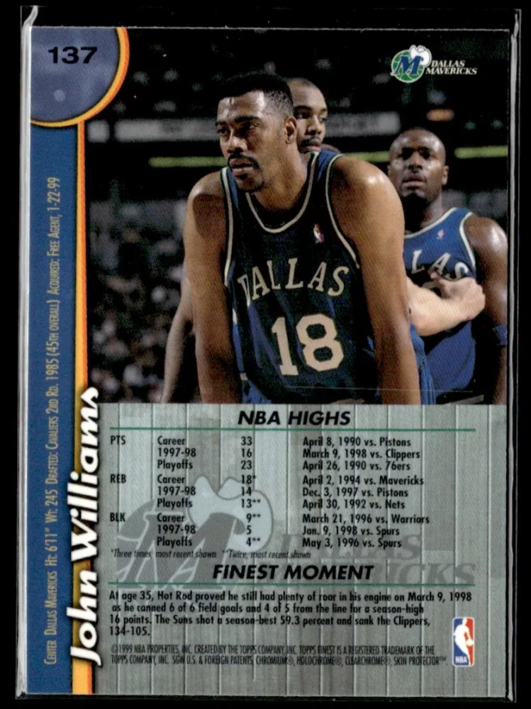 Az eladásra kínált 1998-99 Finest #137 John Williams kosaras kártya NM-MT állapotban van. A kosaras kártyákat legtöbb esetben UP Platinum/Standard puha védőtokban és/vagy UP Toploader (kemény védőtok)-ben küldjük.