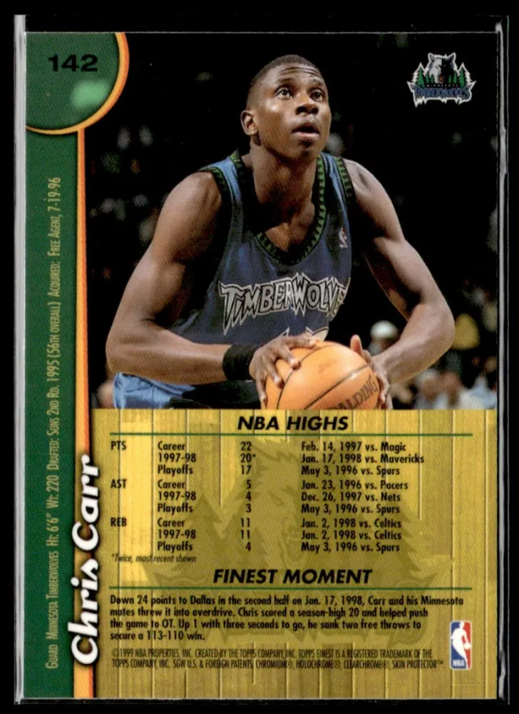 Az eladásra kínált 1998-99 Finest #142 Chris Carr kosaras kártya NM-MT állapotban van. A kosaras kártyákat legtöbb esetben UP Platinum/Standard puha védőtokban és/vagy UP Toploader (kemény védőtok)-ben küldjük.