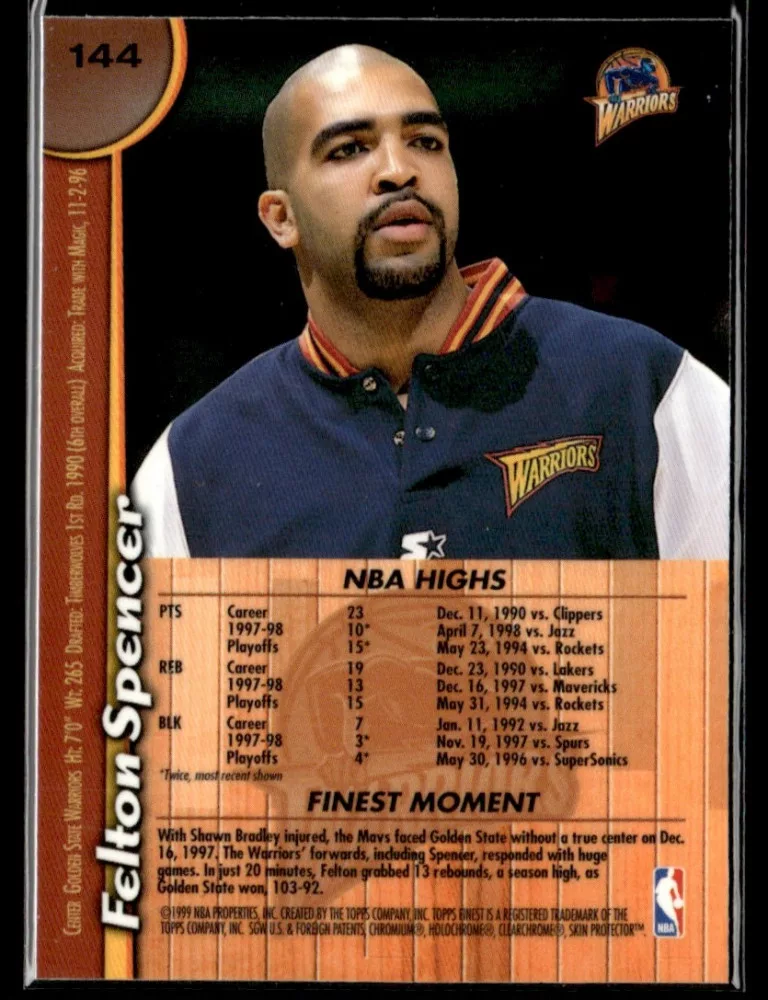 Az eladásra kínált 1998-99 Finest #144 Felton Spencer kosaras kártya NM-MT állapotban van. A kosaras kártyákat legtöbb esetben UP Platinum/Standard puha védőtokban és/vagy UP Toploader (kemény védőtok)-ben küldjük.