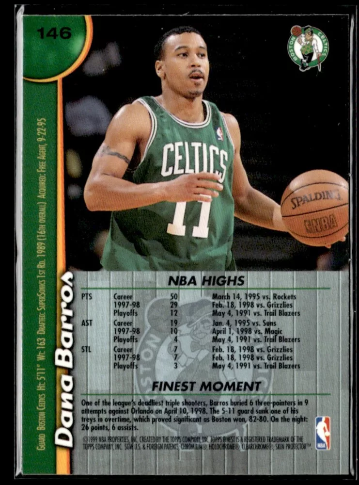 Az eladásra kínált 1998-99 Finest #146 Dana Barros kosaras kártya NM-MT állapotban van. A kosaras kártyákat legtöbb esetben UP Platinum/Standard puha védőtokban és/vagy UP Toploader (kemény védőtok)-ben küldjük.