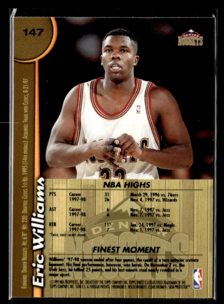 Az eladásra kínált 1998-99 Finest #147 Eric Williams kosaras kártya NM-MT állapotban van. A kosaras kártyákat legtöbb esetben UP Platinum/Standard puha védőtokban és/vagy UP Toploader (kemény védőtok)-ben küldjük.