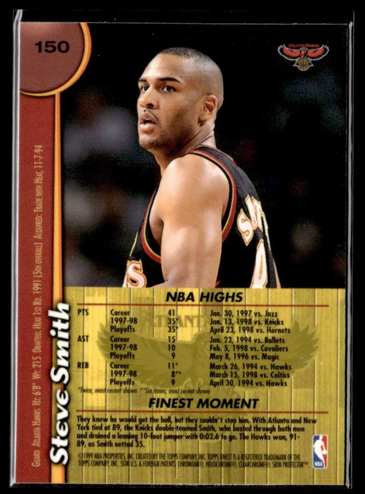 Az eladásra kínált 1998-99 Finest #150 Steve Smith kosaras kártya NM-MT állapotban van. A kosaras kártyákat legtöbb esetben UP Platinum/Standard puha védőtokban és/vagy UP Toploader (kemény védőtok)-ben küldjük.