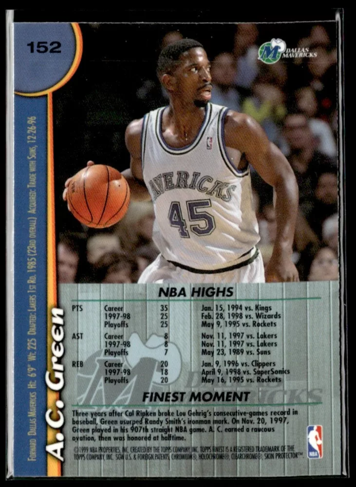 Az eladásra kínált 1998-99 Finest #152 A.C. Green kosaras kártya NM-MT állapotban van. A kosaras kártyákat legtöbb esetben UP Platinum/Standard puha védőtokban és/vagy UP Toploader (kemény védőtok)-ben küldjük.