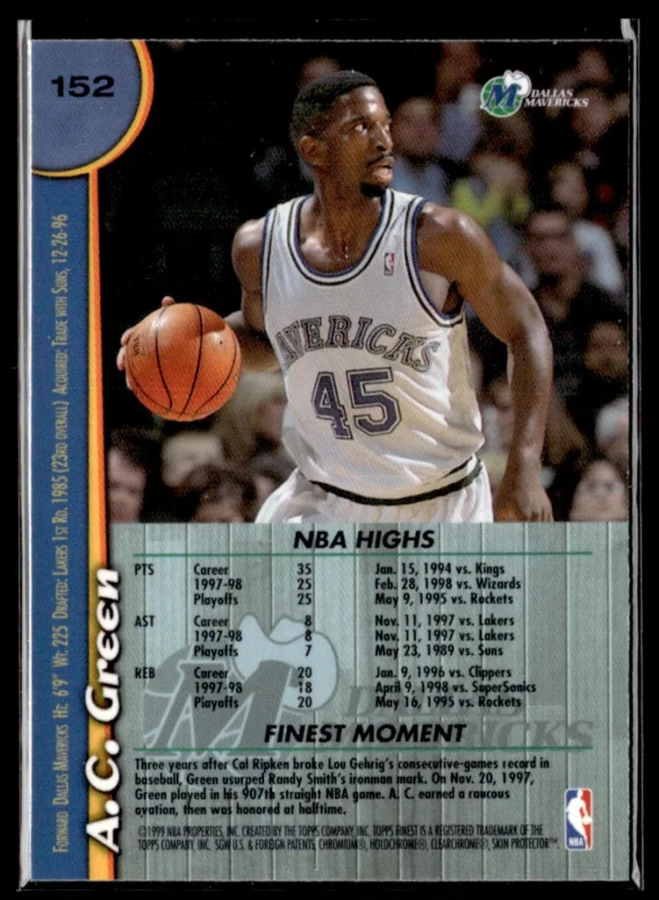 Az eladásra kínált 1998-99 Finest #152 A.C. Green kosaras kártya NM-MT állapotban van. A kosaras kártyákat legtöbb esetben UP Platinum/Standard puha védőtokban és/vagy UP Toploader (kemény védőtok)-ben küldjük.