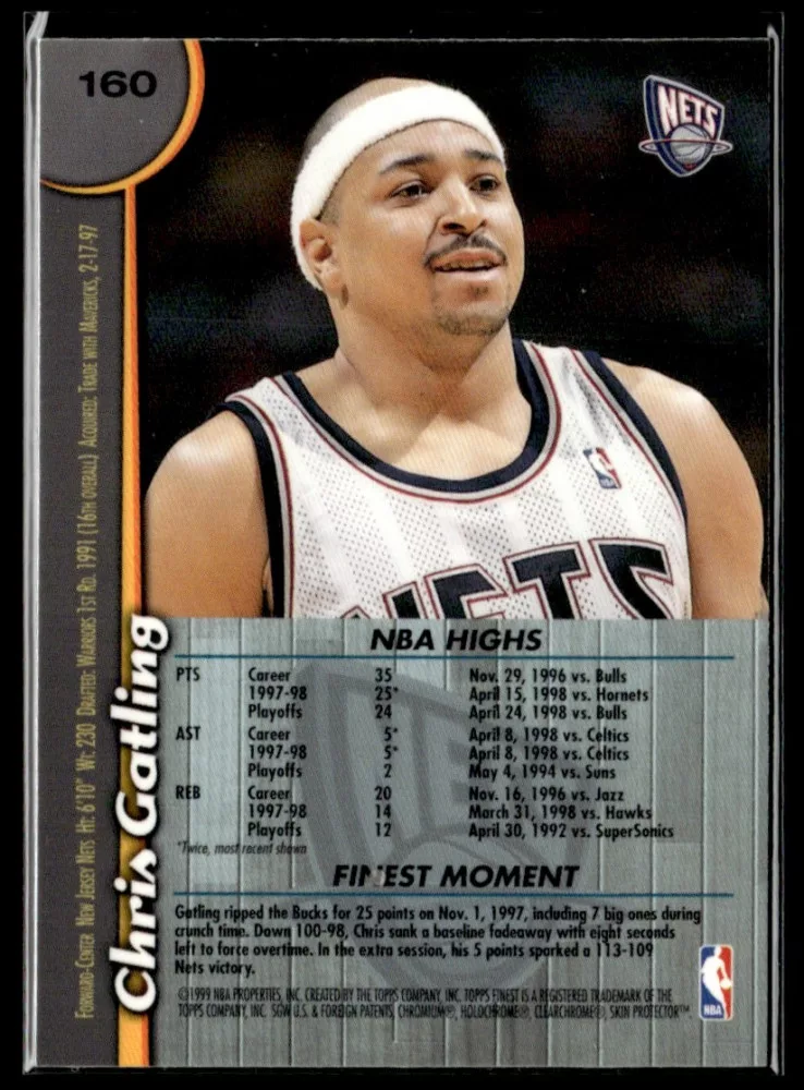 Az eladásra kínált 1998-99 Finest #160 Chris Gatling kosaras kártya NM-MT állapotban van. A kosaras kártyákat legtöbb esetben UP Platinum/Standard puha védőtokban és/vagy UP Toploader (kemény védőtok)-ben küldjük.