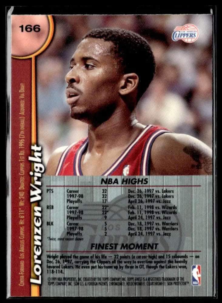 Az eladásra kínált 1998-99 Finest #166 Lorenzen Wright kosaras kártya NM-MT állapotban van. A kosaras kártyákat legtöbb esetben UP Platinum/Standard puha védőtokban és/vagy UP Toploader (kemény védőtok)-ben küldjük.
