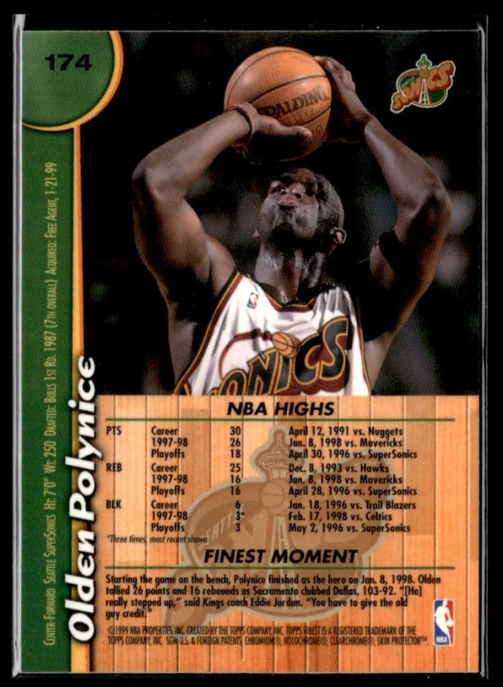 Az eladásra kínált 1998-99 Finest #174 Olden Polynice kosaras kártya NM-MT állapotban van. A kosaras kártyákat legtöbb esetben UP Platinum/Standard puha védőtokban és/vagy UP Toploader (kemény védőtok)-ben küldjük.