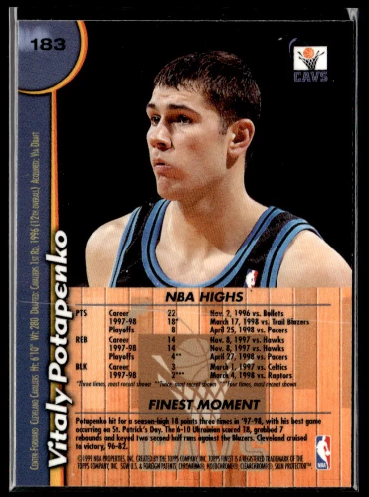 Az eladásra kínált 1998-99 Finest #183 Vitaly Potapenko kosaras kártya NM-MT állapotban van. A kosaras kártyákat legtöbb esetben UP Platinum/Standard puha védőtokban és/vagy UP Toploader (kemény védőtok)-ben küldjük.