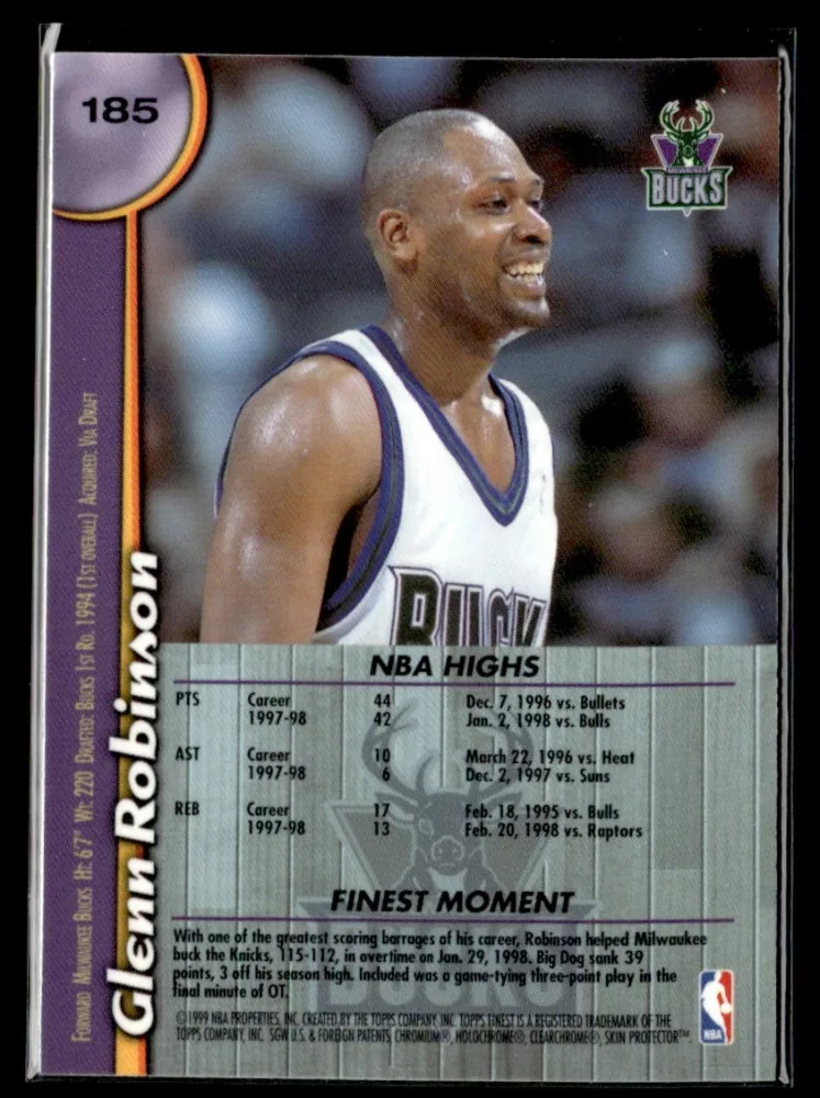 Az eladásra kínált 1998-99 Finest #185 Glenn Robinson kosaras kártya NM-MT állapotban van. A kosaras kártyákat legtöbb esetben UP Platinum/Standard puha védőtokban és/vagy UP Toploader (kemény védőtok)-ben küldjük.
