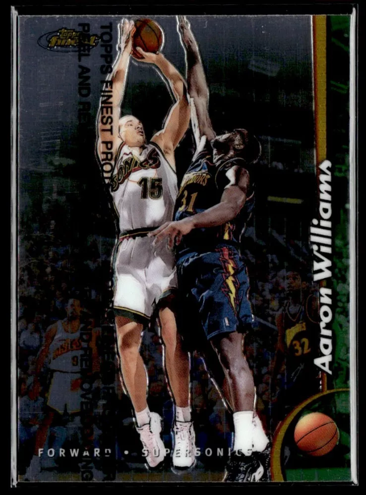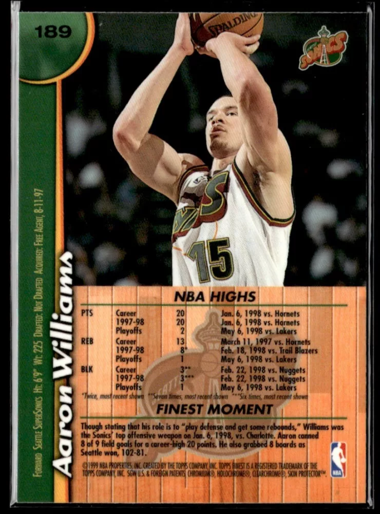 Az eladásra kínált 1998-99 Finest #189 Aaron Williams kosaras kártya NM-MT állapotban van. A kosaras kártyákat legtöbb esetben UP Platinum/Standard puha védőtokban és/vagy UP Toploader (kemény védőtok)-ben küldjük.