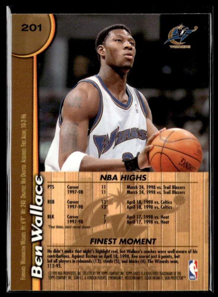 Az eladásra kínált 1998-99 Finest #201 Ben Wallace kosaras kártya NM-MT állapotban van. A kosaras kártyákat legtöbb esetben UP Platinum/Standard puha védőtokban és/vagy UP Toploader (kemény védőtok)-ben küldjük.