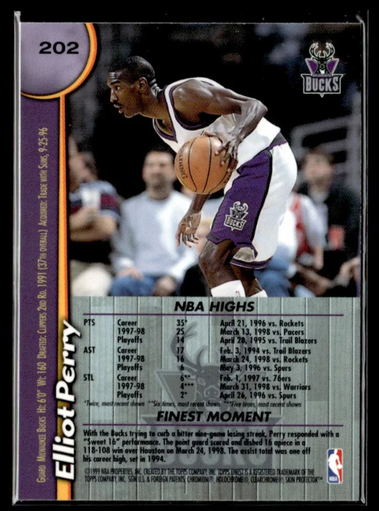Az eladásra kínált 1998-99 Finest #202 Elliot Perry kosaras kártya NM-MT állapotban van. A kosaras kártyákat legtöbb esetben UP Platinum/Standard puha védőtokban és/vagy UP Toploader (kemény védőtok)-ben küldjük.
