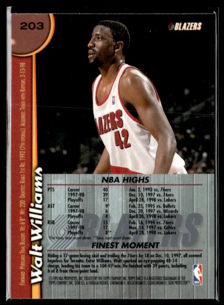 Az eladásra kínált 1998-99 Finest #203 Walt Williams kosaras kártya NM-MT állapotban van. A kosaras kártyákat legtöbb esetben UP Platinum/Standard puha védőtokban és/vagy UP Toploader (kemény védőtok)-ben küldjük.