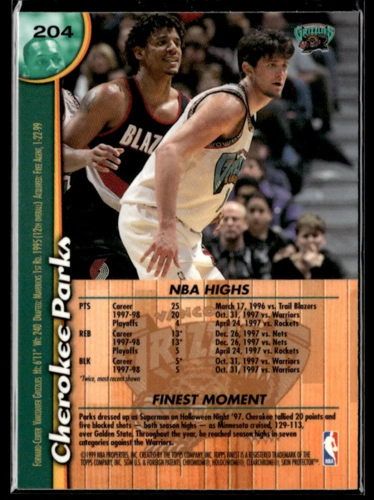 Az eladásra kínált 1998-99 Finest #204 Cherokee Parks kosaras kártya NM-MT állapotban van. A kosaras kártyákat legtöbb esetben UP Platinum/Standard puha védőtokban és/vagy UP Toploader (kemény védőtok)-ben küldjük.