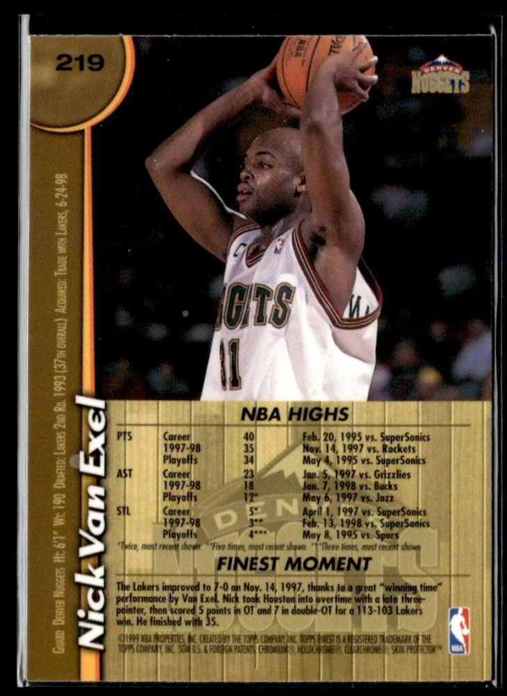 Az eladásra kínált 1998-99 Finest #219 Nick Van Exel kosaras kártya NM-MT állapotban van. A kosaras kártyákat legtöbb esetben UP Platinum/Standard puha védőtokban és/vagy UP Toploader (kemény védőtok)-ben küldjük.